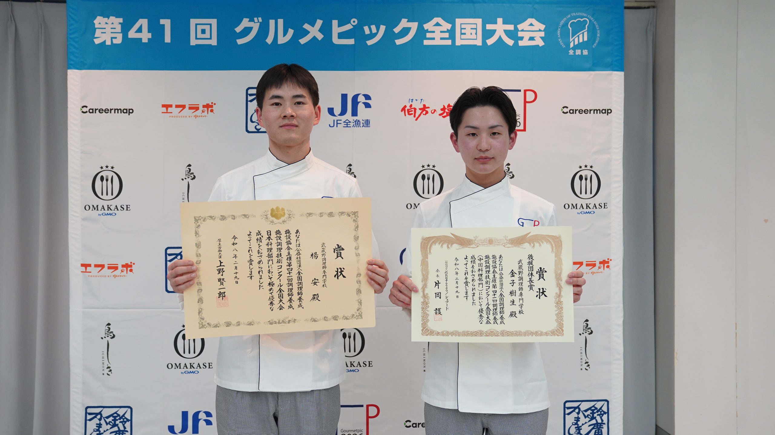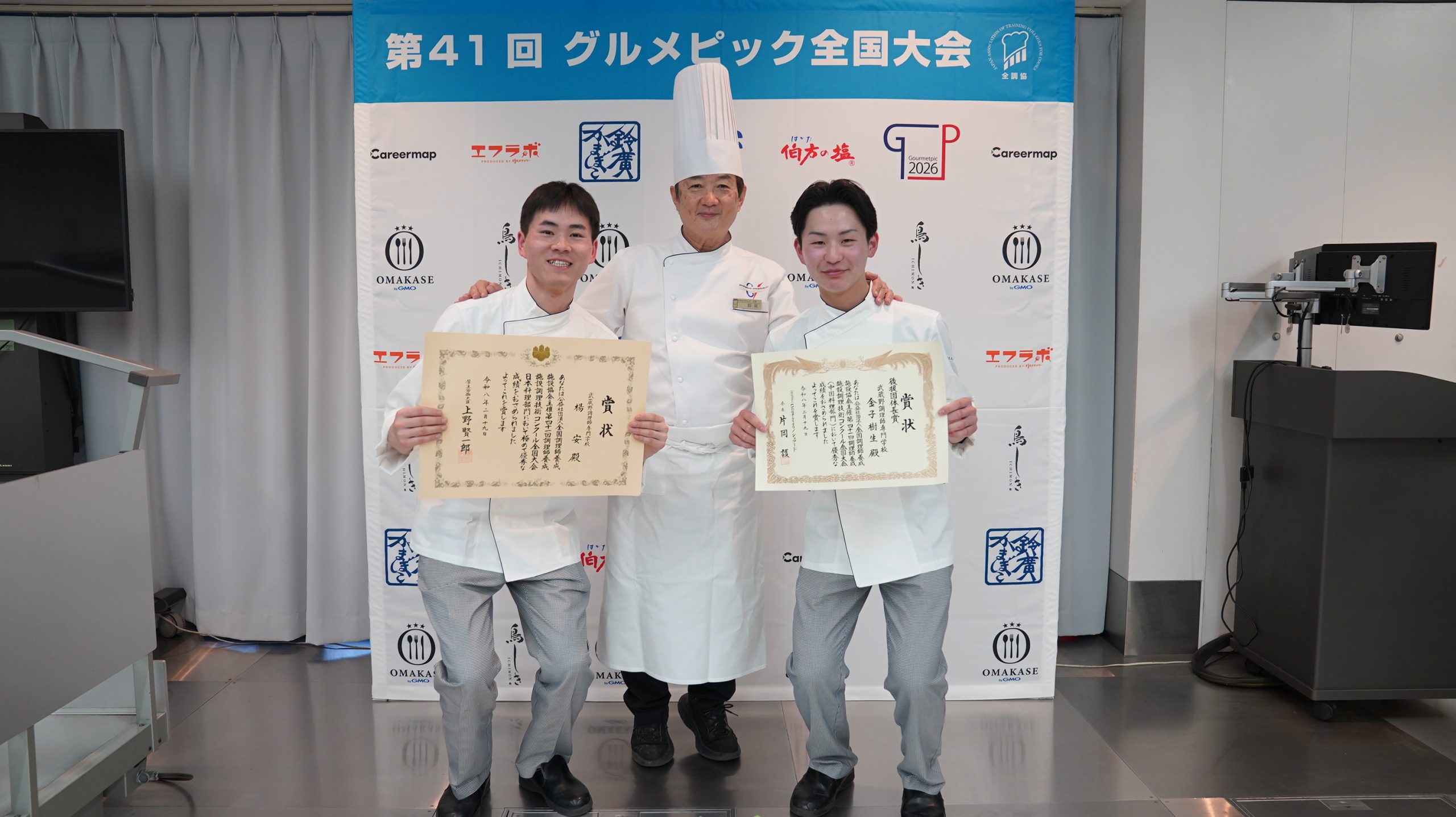 公益社団法人全国調理師養成施設協会主催第41回調理師養成施設調理技術コンクール(グルメピック)全国大会において日本料理部門全国2位である厚生労働大臣賞を高度調理経営科日本料理専攻の楊 安さんが受賞し、高度調理経営科中国料理専攻の金子 樹生さんが後援団体長賞を受賞しました。